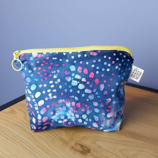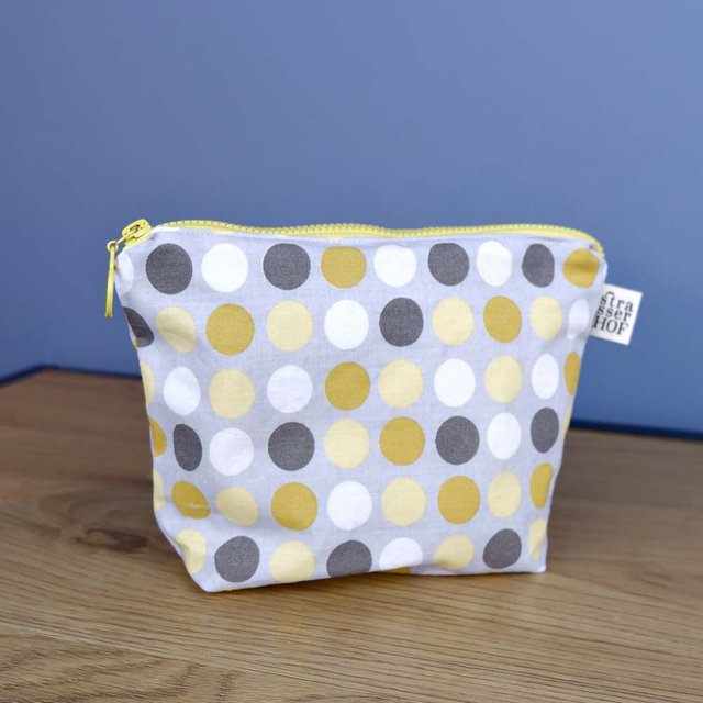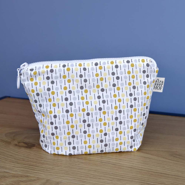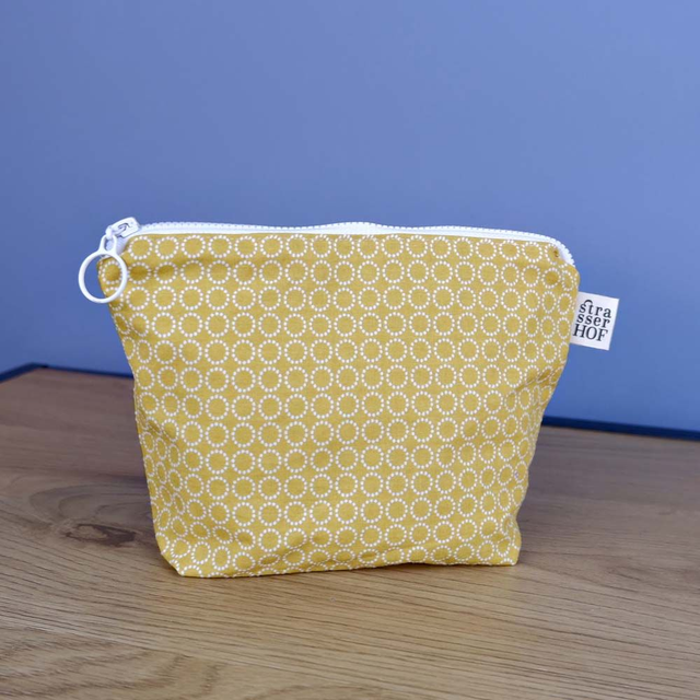 Handgefertiges Täschchen aus Baumwolle mit farbigem Reißverschluss. Strasserhof-Logo seitlich und innen. Unterschiedliche Farben bzw. Muster erhältlich, je nach Verfügbarkeit. Jedes Täschchen ist ein Unikat und kann sich von der Abbildung leicht unterscheiden, z.B. in der Farbe des Reißverschlusses oder von der Platzierung des Musters.